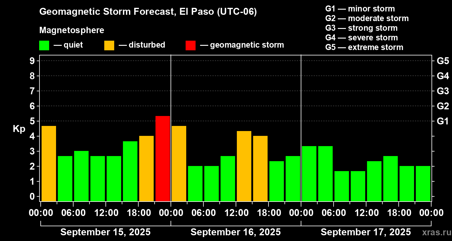 Geomagnetic storm forecast in El Paso for Sep 15, 2025
