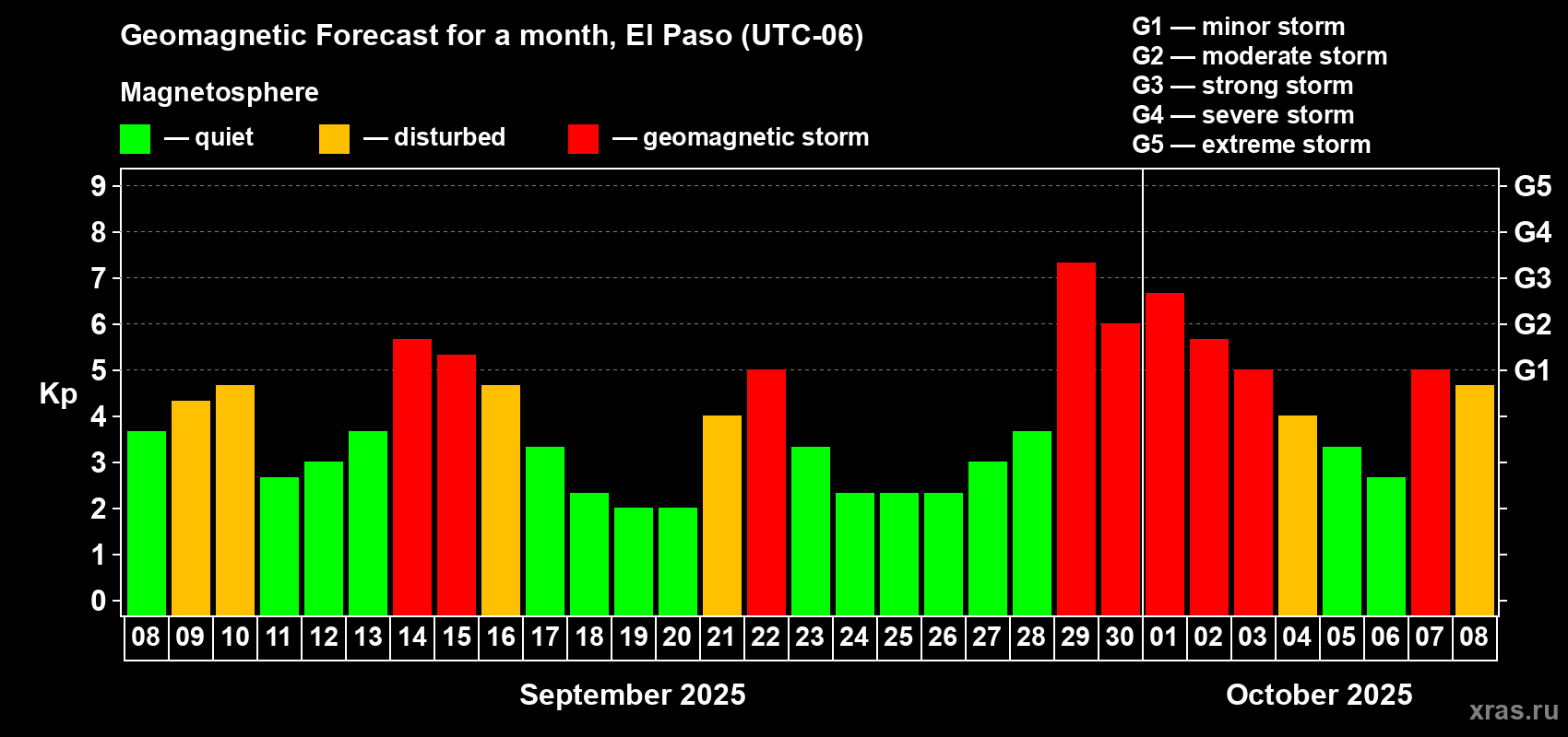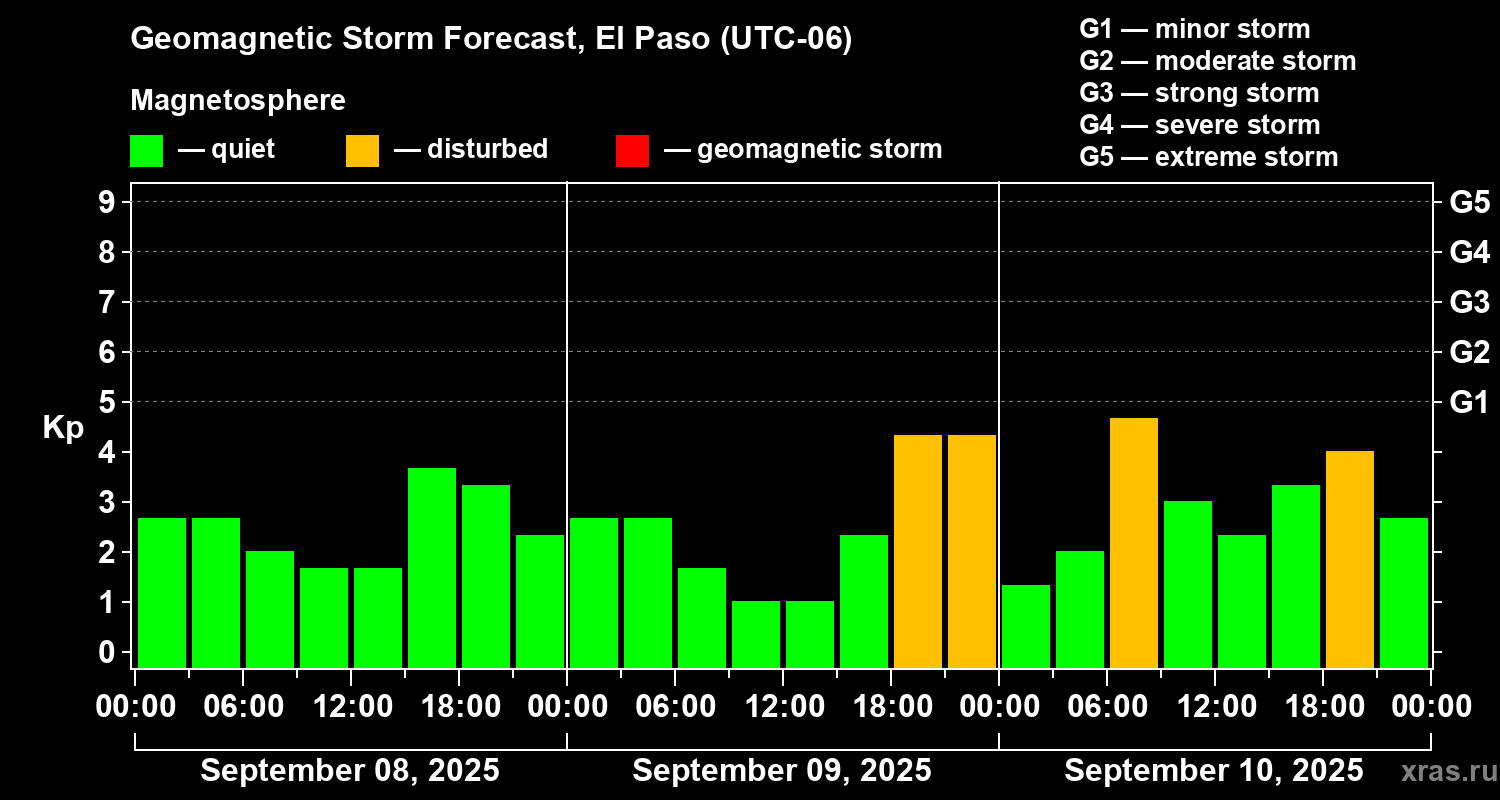 Geomagnetic storm forecast in El Paso for Sep 08, 2025