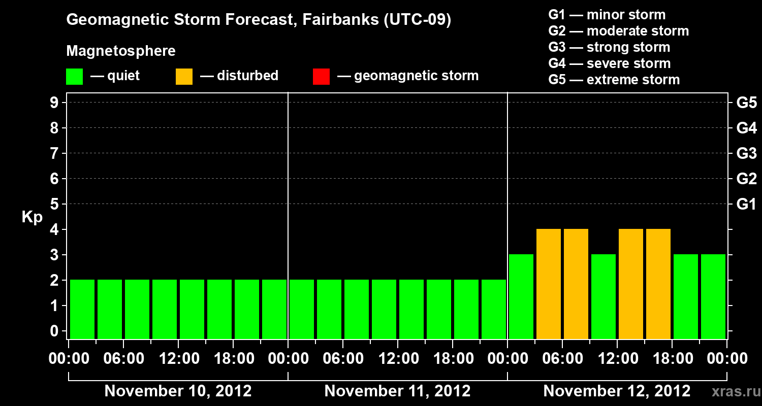 Geomagnetic storm forecast in Fairbanks for Nov 10, 2012