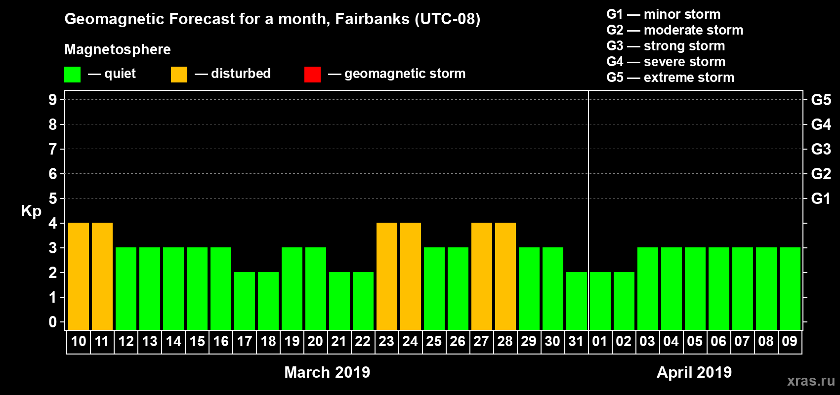Geomagnetic storm forecast in Fairbanks for Mar 10, 2019