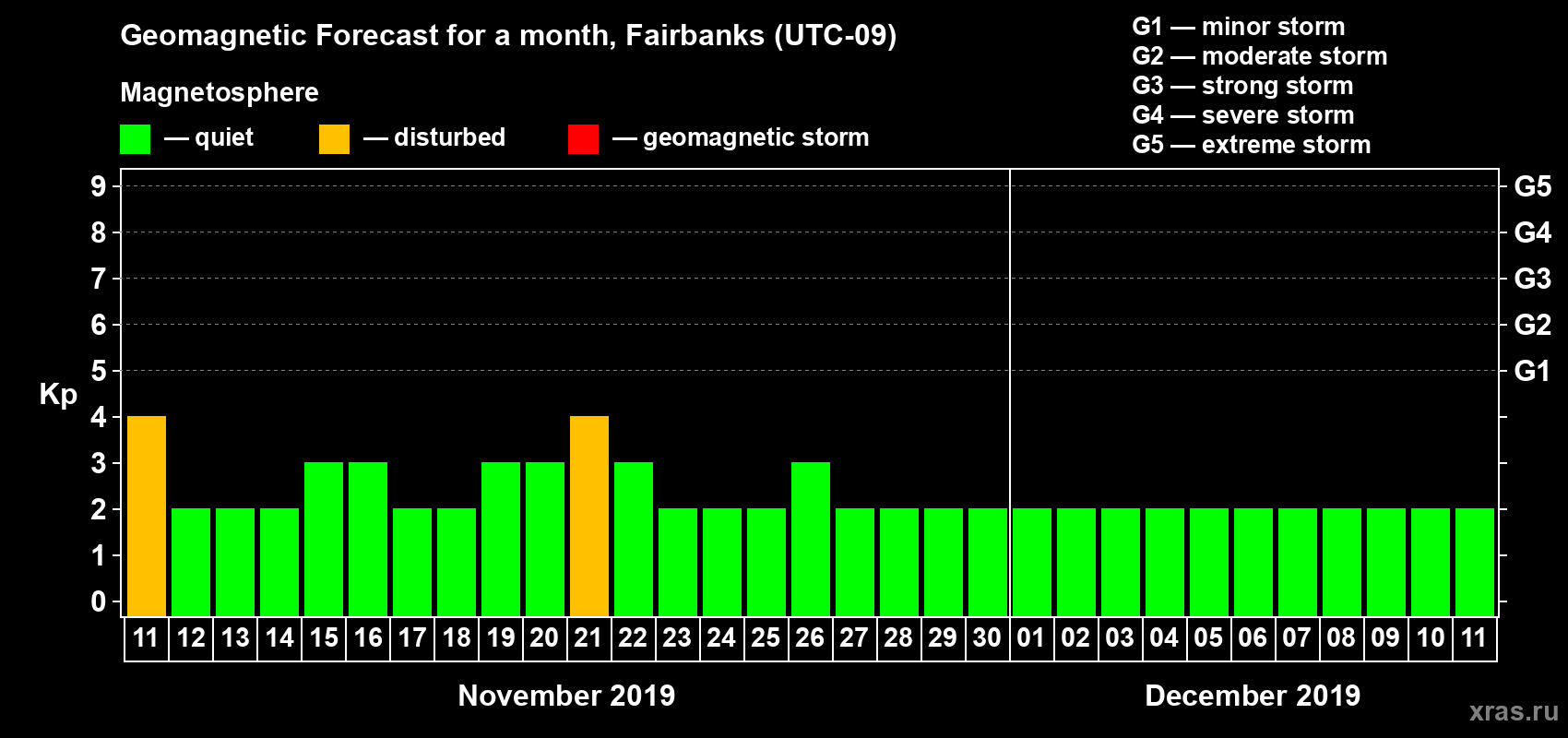 Geomagnetic storm forecast in Fairbanks for Nov 11, 2019