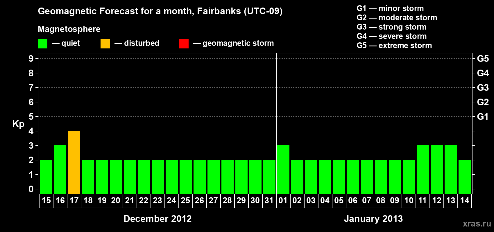 Geomagnetic storm forecast in Fairbanks for Dec 15, 2012