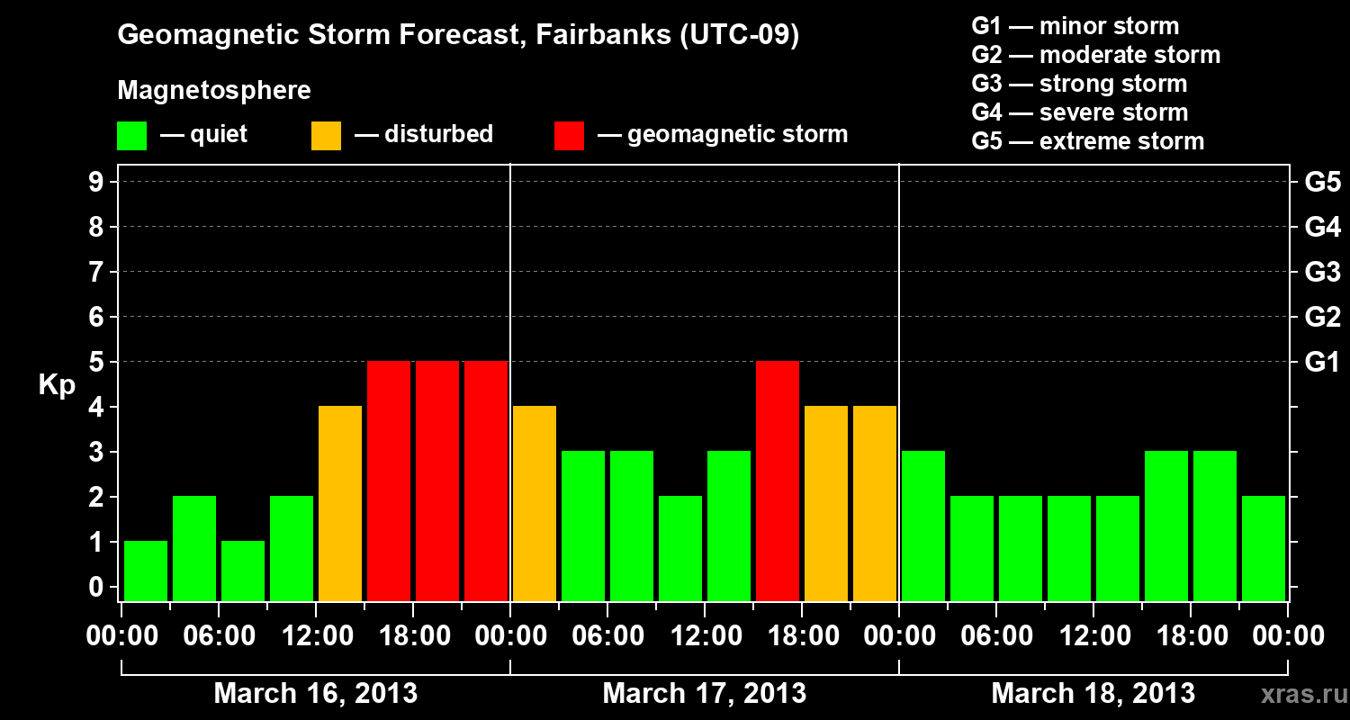 Geomagnetic storm forecast in Fairbanks for Mar 16, 2013