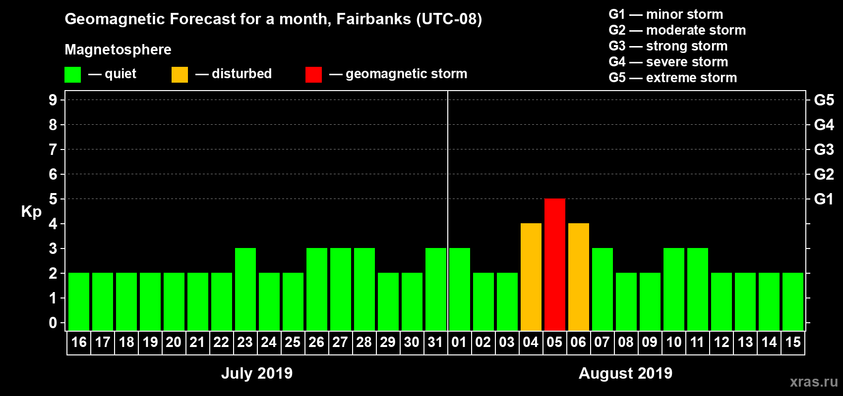 Geomagnetic storm forecast in Fairbanks for Jul 16, 2019
