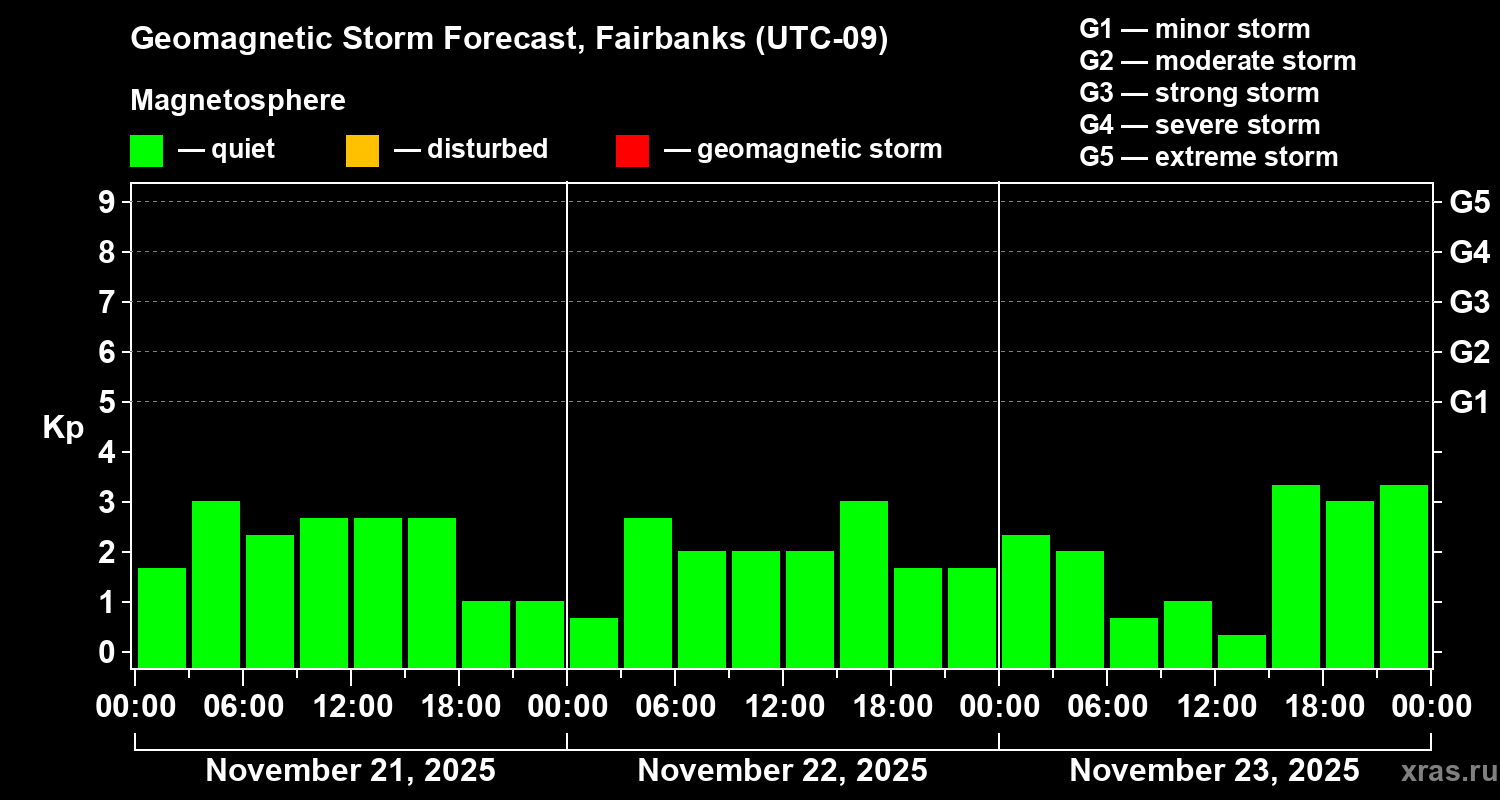 Geomagnetic storm forecast in Fairbanks for Nov 21, 2025