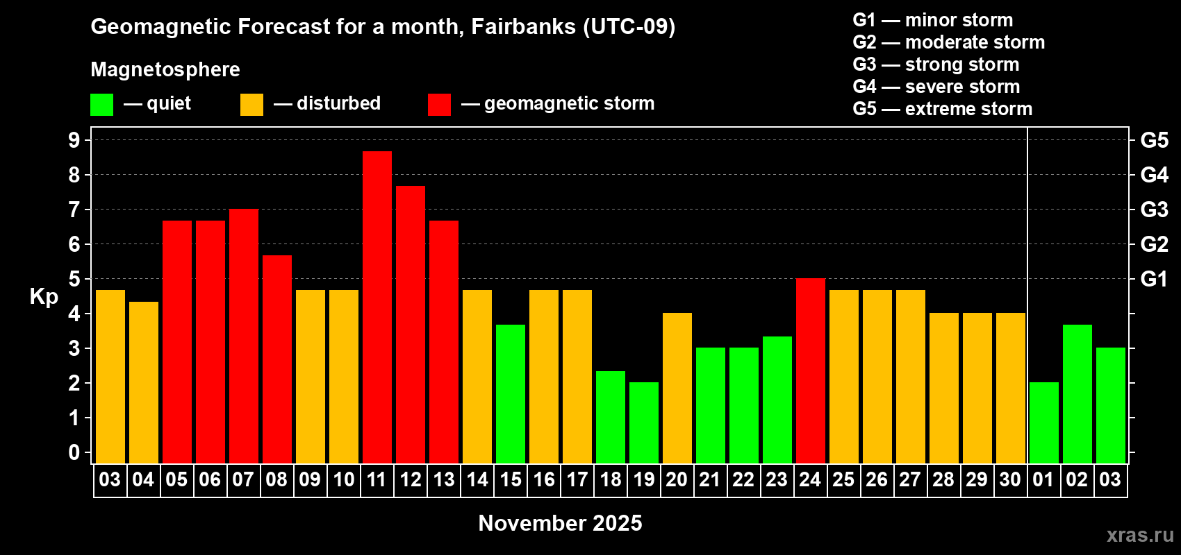 Geomagnetic storm forecast in Fairbanks for Nov 03, 2025
