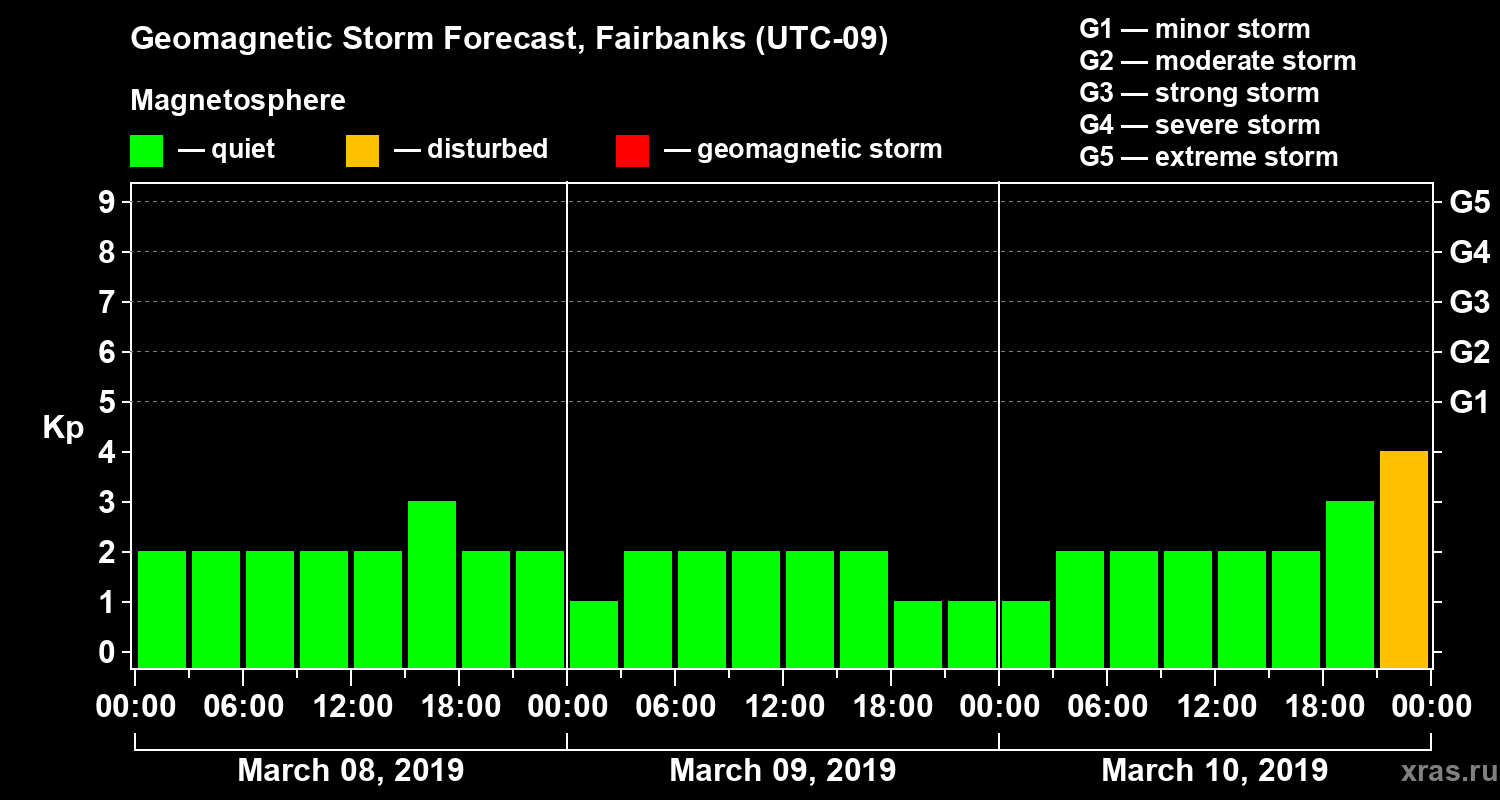 Geomagnetic storm forecast in Fairbanks for Mar 08, 2019