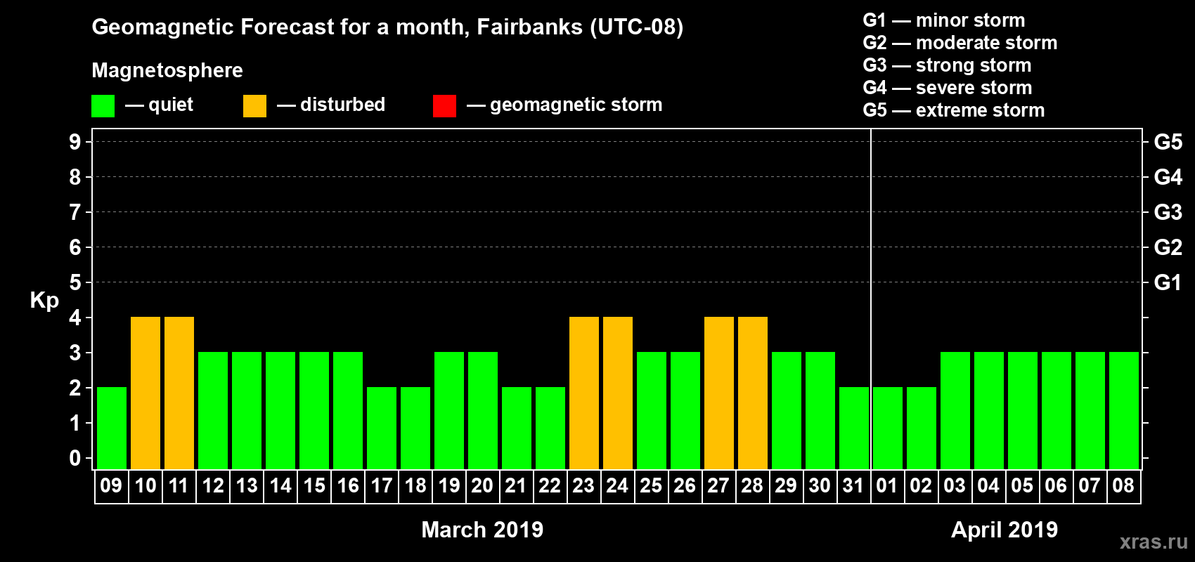 Geomagnetic storm forecast in Fairbanks for Mar 09, 2019