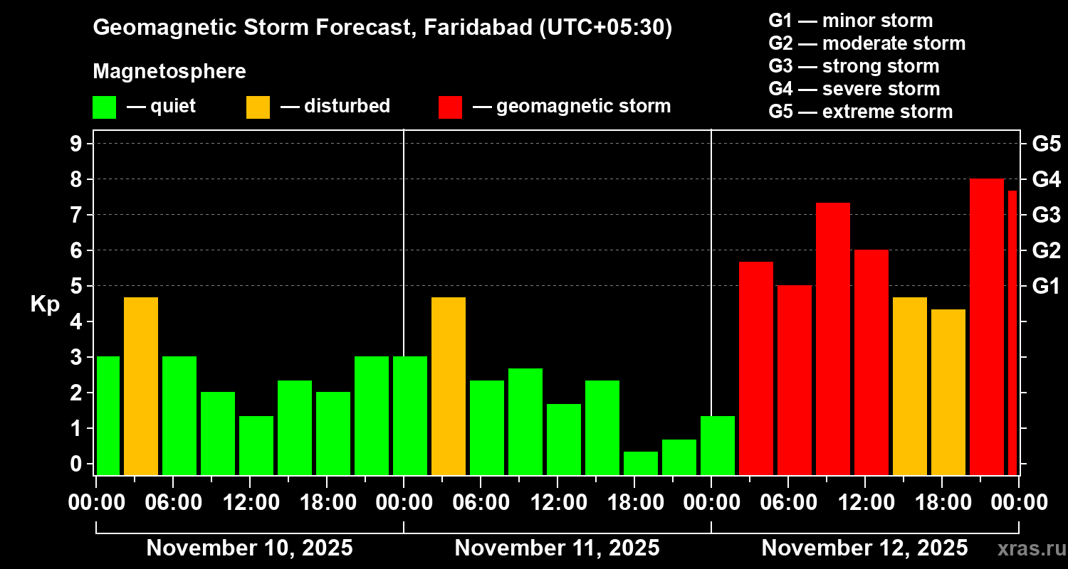 Geomagnetic storm forecast in Faridabad for Nov 10, 2025