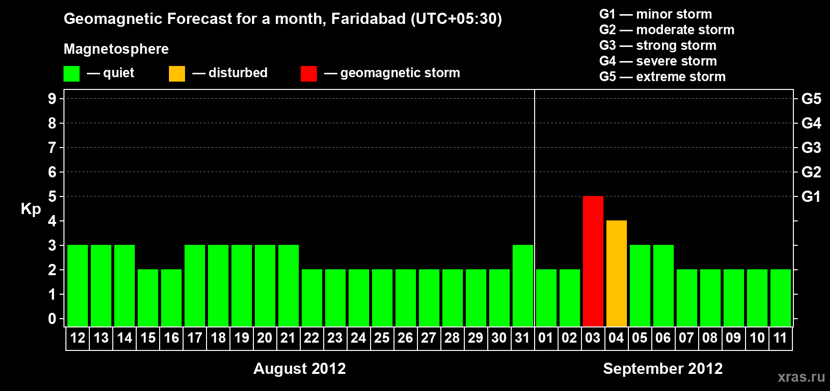 Geomagnetic storm forecast in Faridabad for Aug 12, 2012