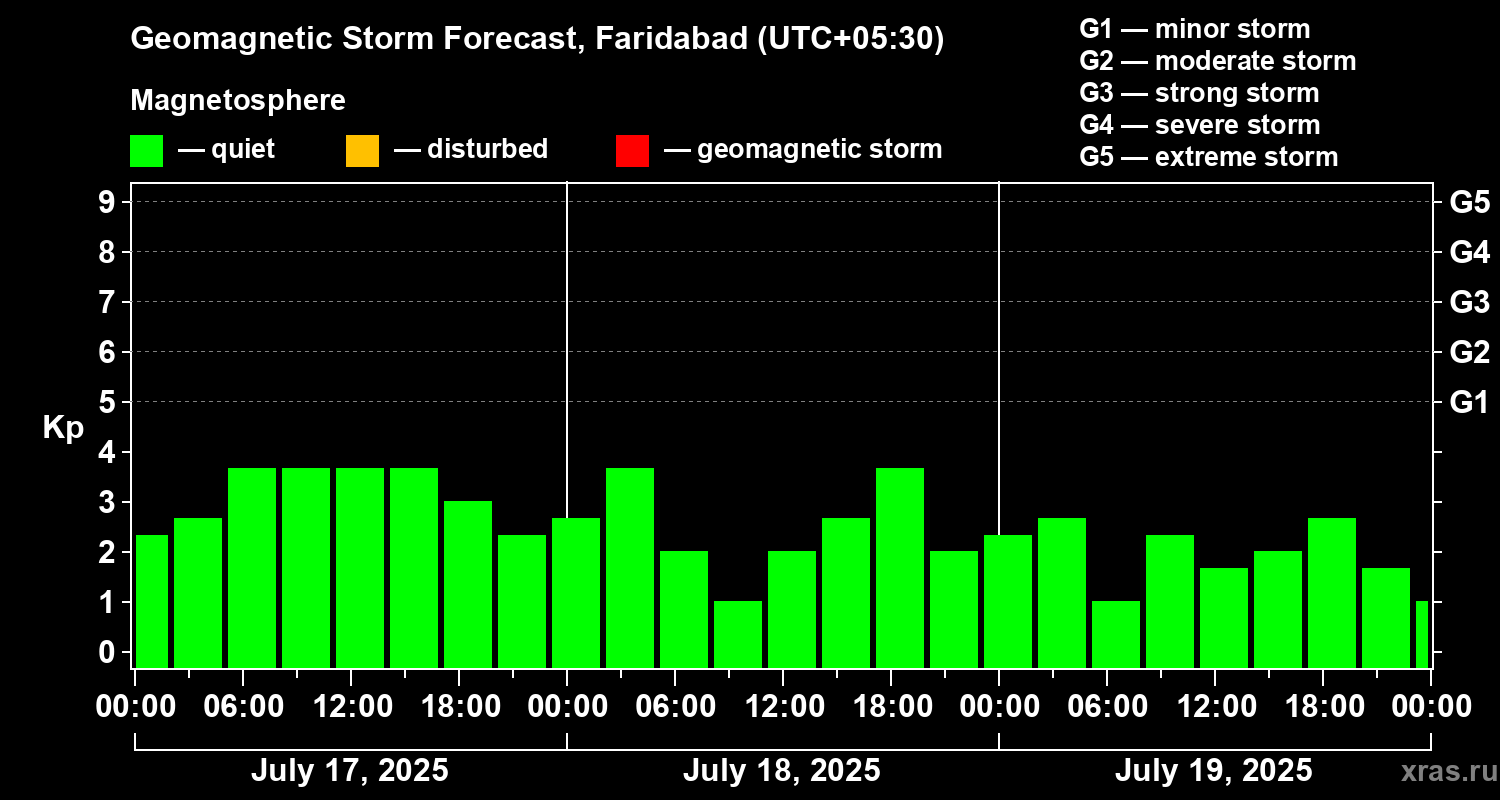 Geomagnetic storm forecast in Faridabad for Jul 17, 2025