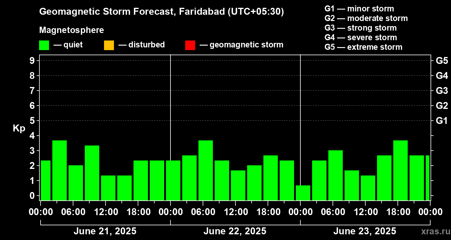 Geomagnetic storm forecast in Faridabad for Jun 21, 2025