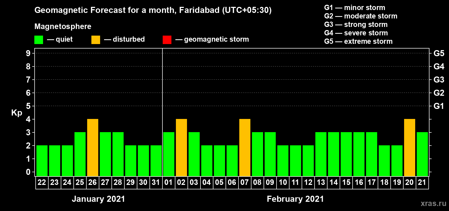 Geomagnetic storm forecast in Faridabad for Jan 22, 2021