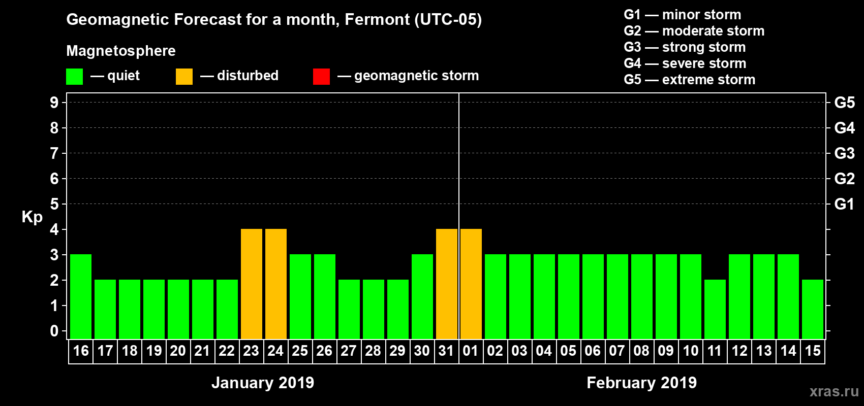 Geomagnetic storm forecast in Fermont for Jan 16, 2019