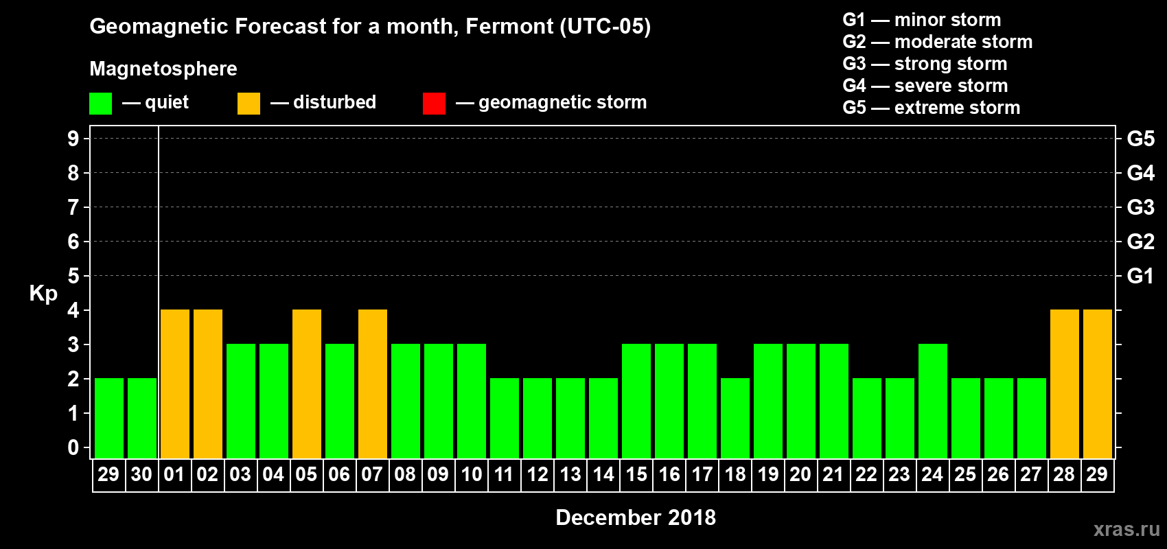 Geomagnetic index Kp forecast from Nov 29, 2018 to Dec 01, 2018 for mid latitudes