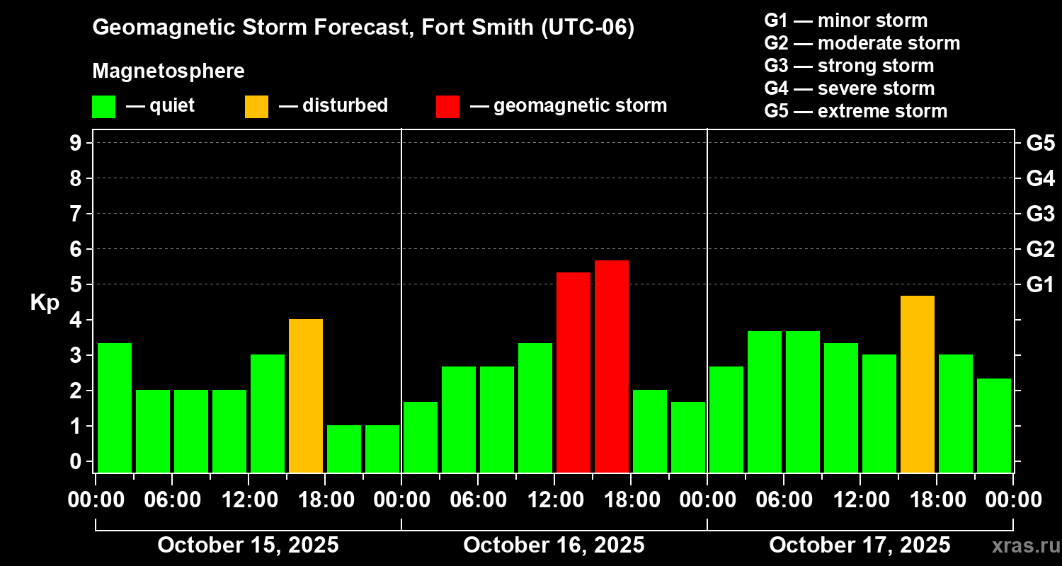 Geomagnetic storm forecast in Fort Smith for Oct 15, 2025
