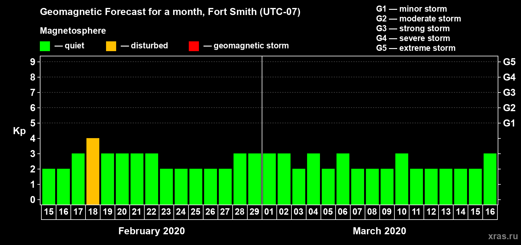 Geomagnetic storm forecast in Fort Smith for Feb 15, 2020