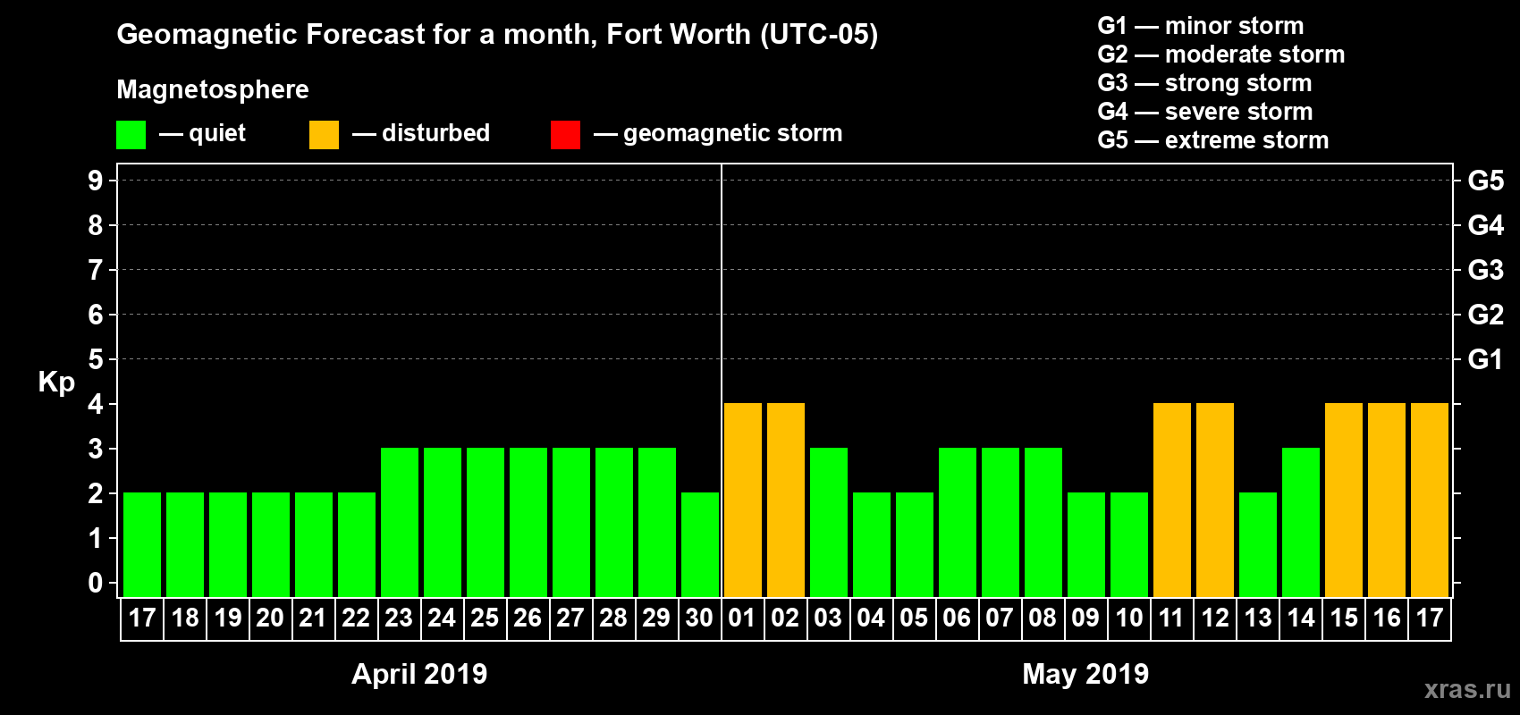 Geomagnetic storm forecast in Fort Worth for Apr 17, 2019