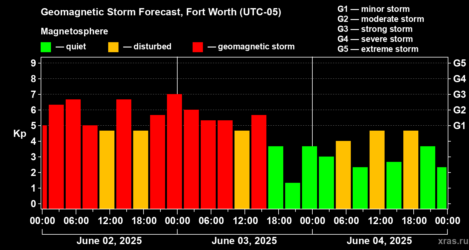 Geomagnetic storm forecast in Fort Worth for Jun 02, 2025