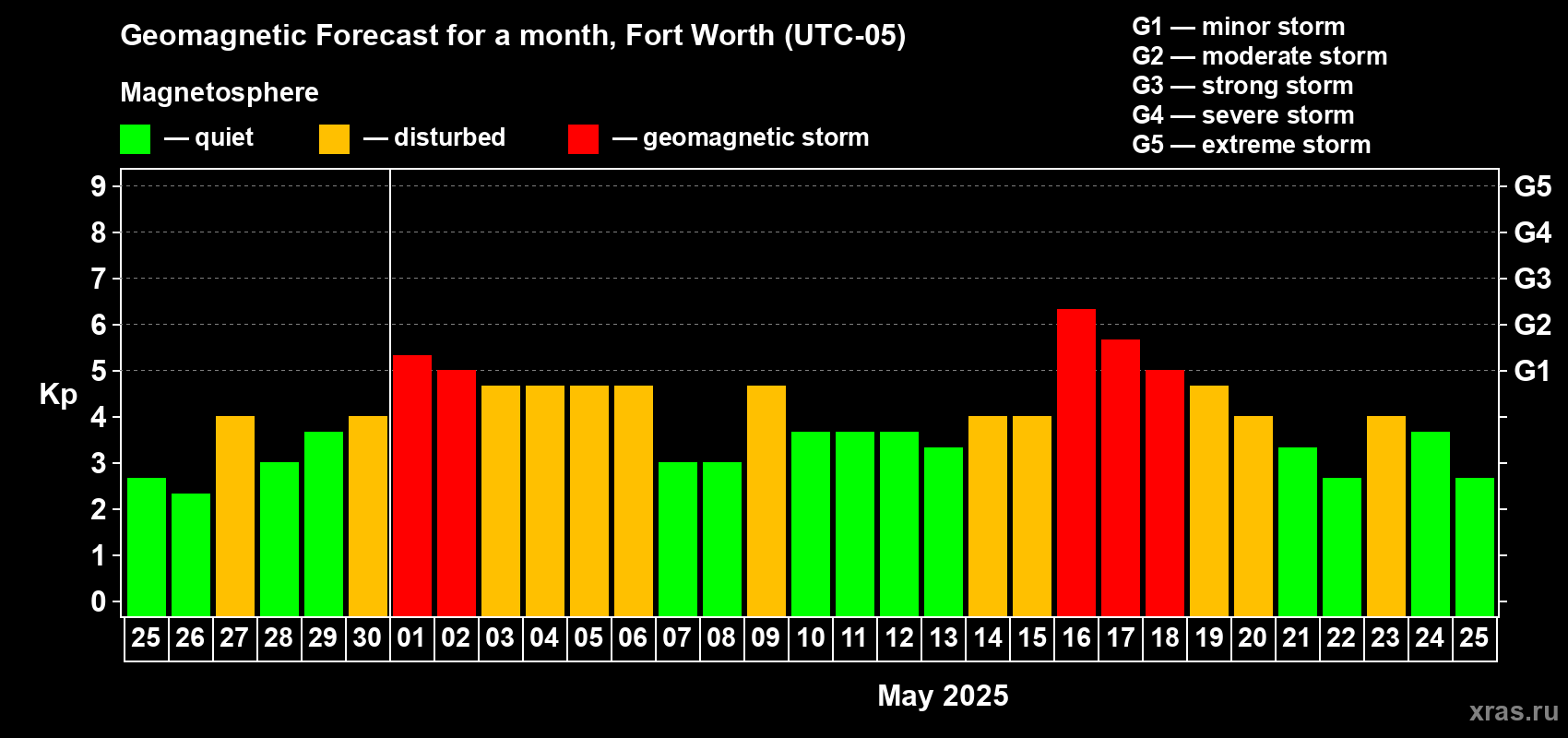 Geomagnetic storm forecast in Fort Worth for Apr 25, 2025