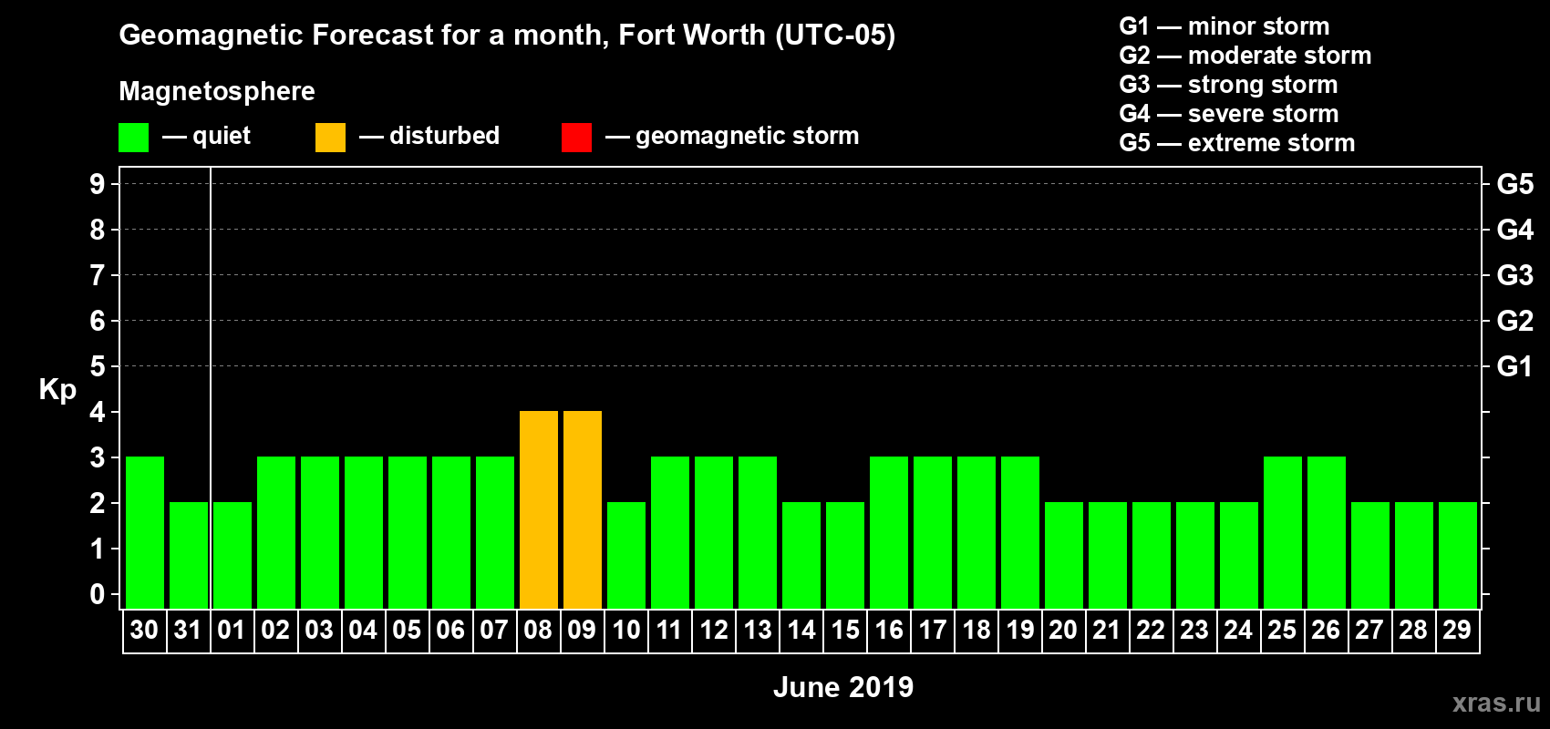 Geomagnetic storm forecast in Fort Worth for May 30, 2019