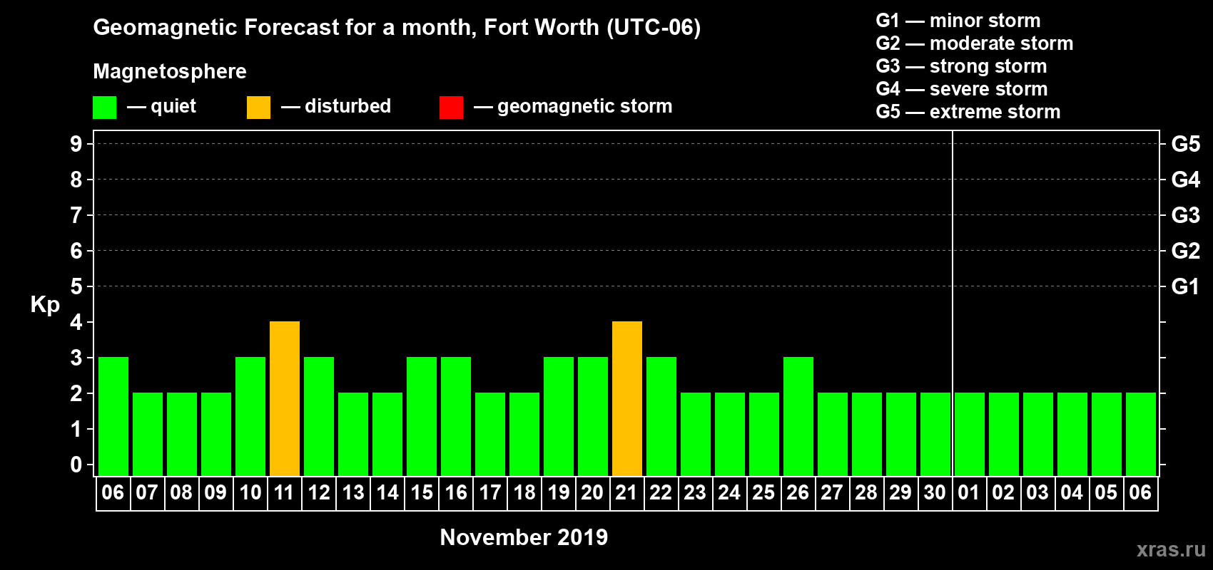 Geomagnetic storm forecast in Fort Worth for Nov 06, 2019