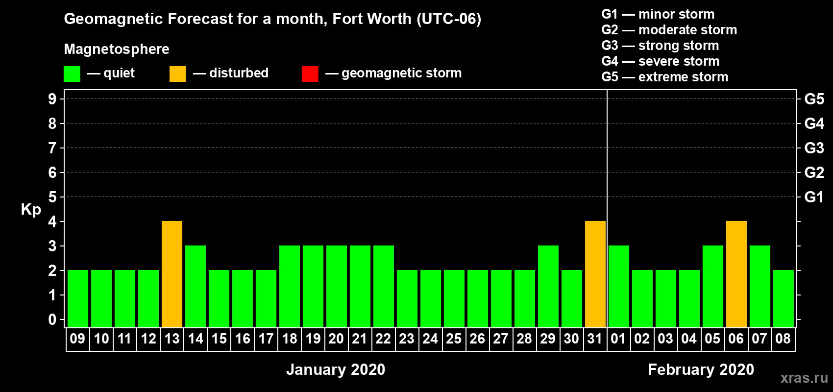 Geomagnetic storm forecast in Fort Worth for Jan 09, 2020