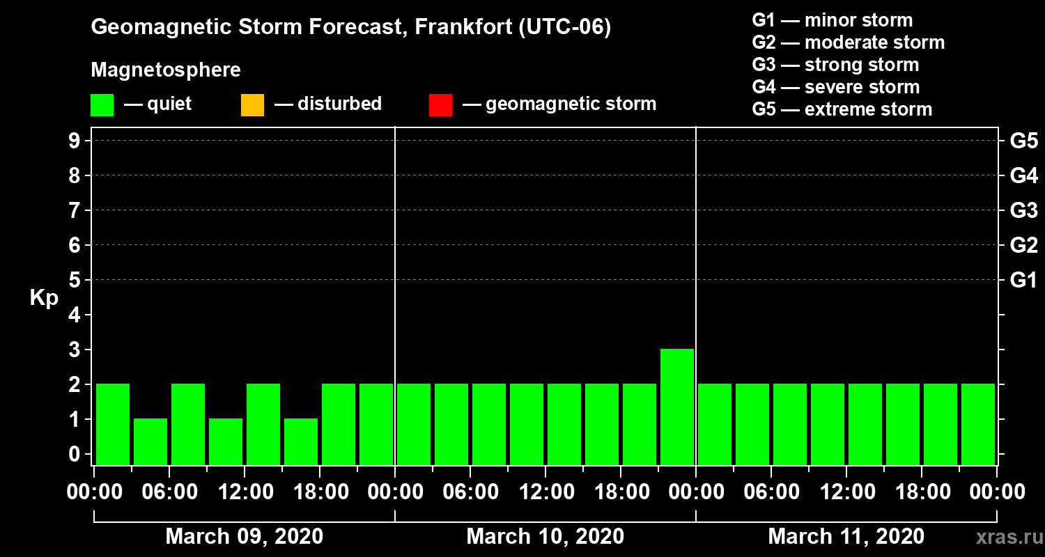 Geomagnetic storm forecast in Frankfort for Mar 09, 2020