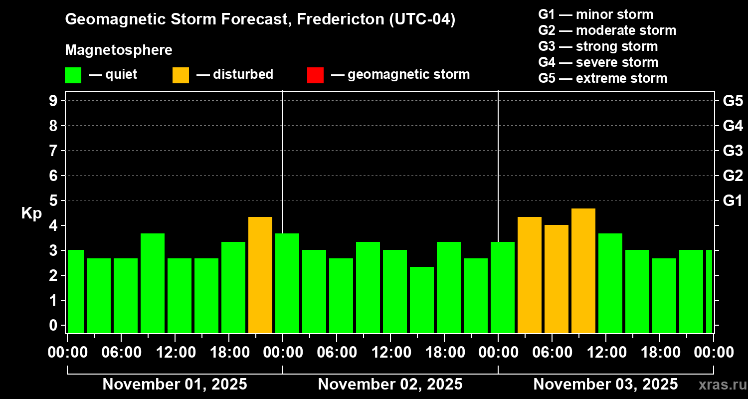 Geomagnetic storm forecast in Fredericton for Nov 01, 2025