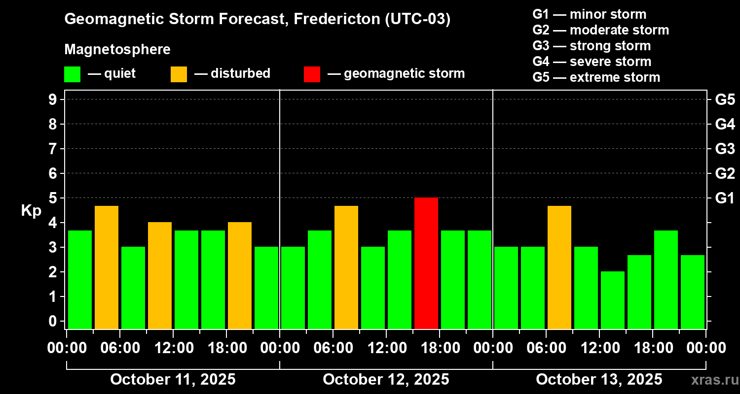 Geomagnetic storm forecast in Fredericton for Oct 11, 2025