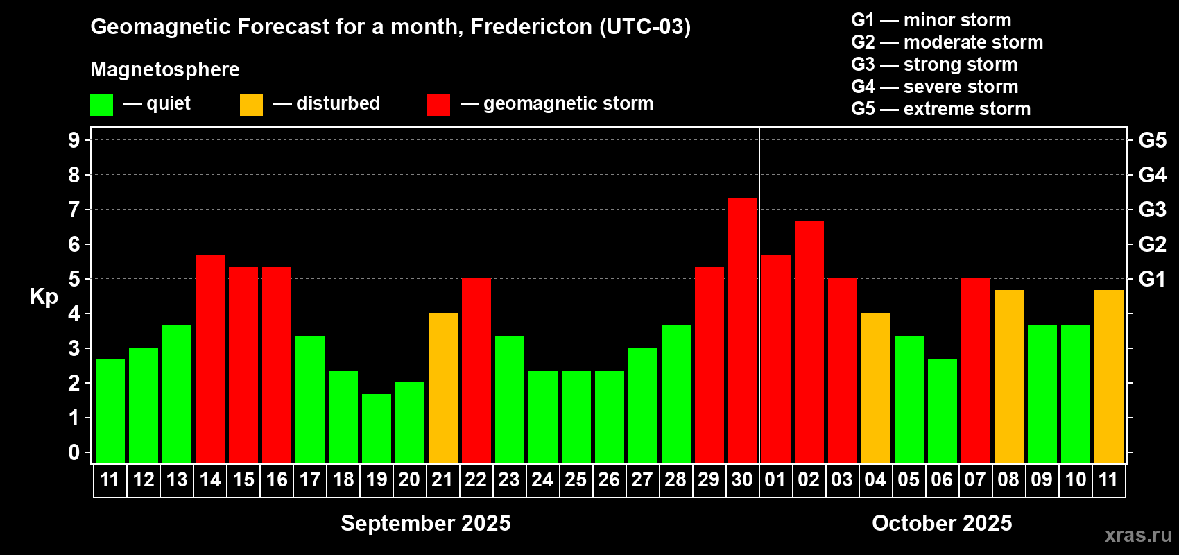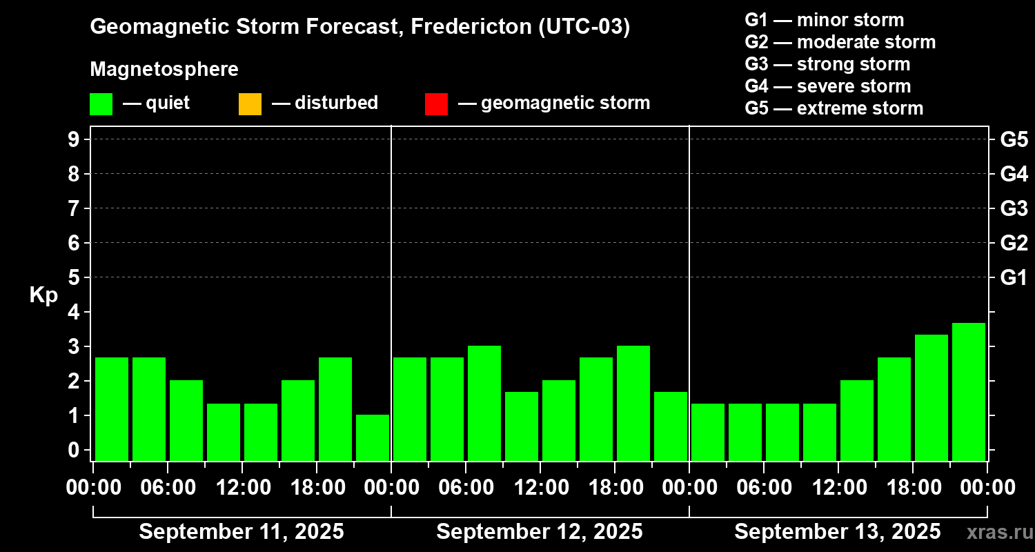 Geomagnetic storm forecast in Fredericton for Sep 11, 2025