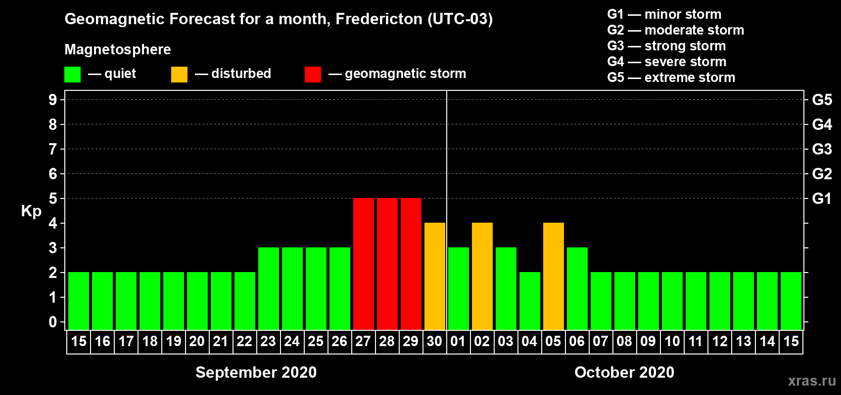 Geomagnetic storm forecast in Fredericton for Sep 15, 2020