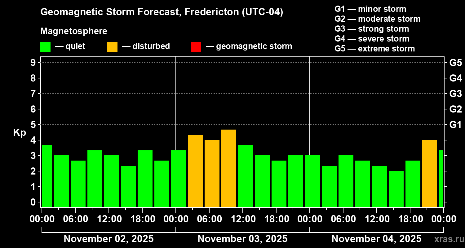 Geomagnetic storm forecast in Fredericton for Nov 02, 2025