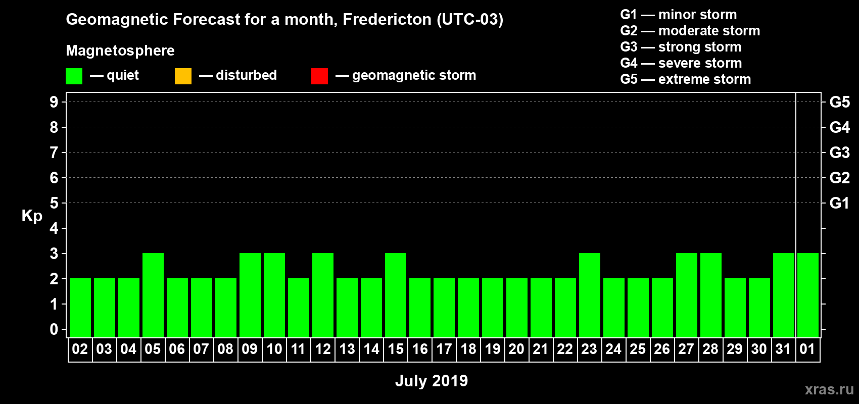 Geomagnetic storm forecast in Fredericton for Jul 02, 2019