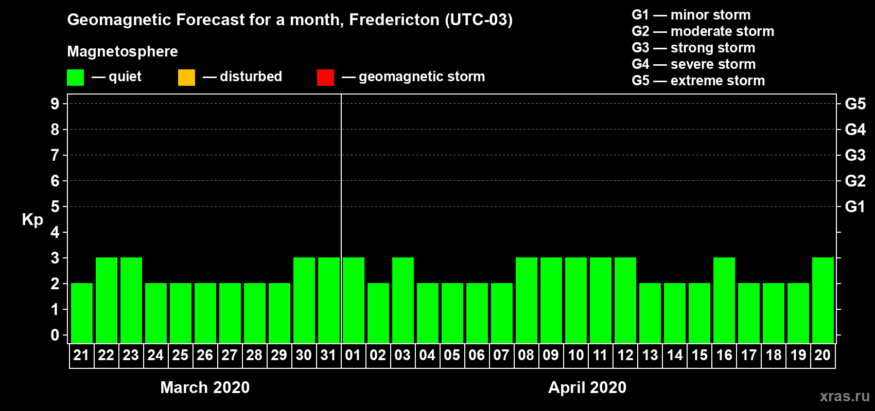 Geomagnetic activity forecast in Fredericton — Mar 21, 2020