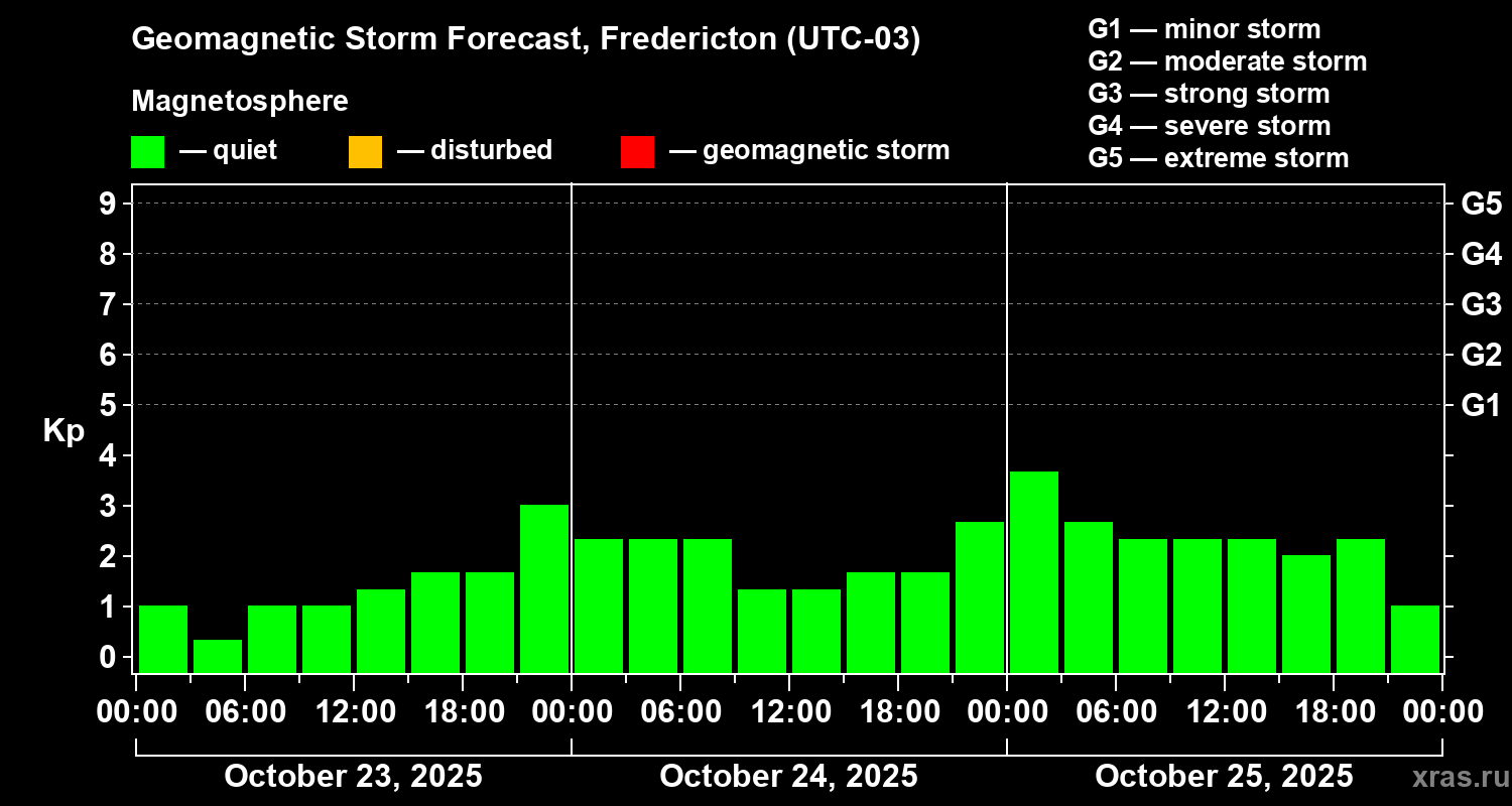 Geomagnetic storm forecast in Fredericton for Oct 23, 2025