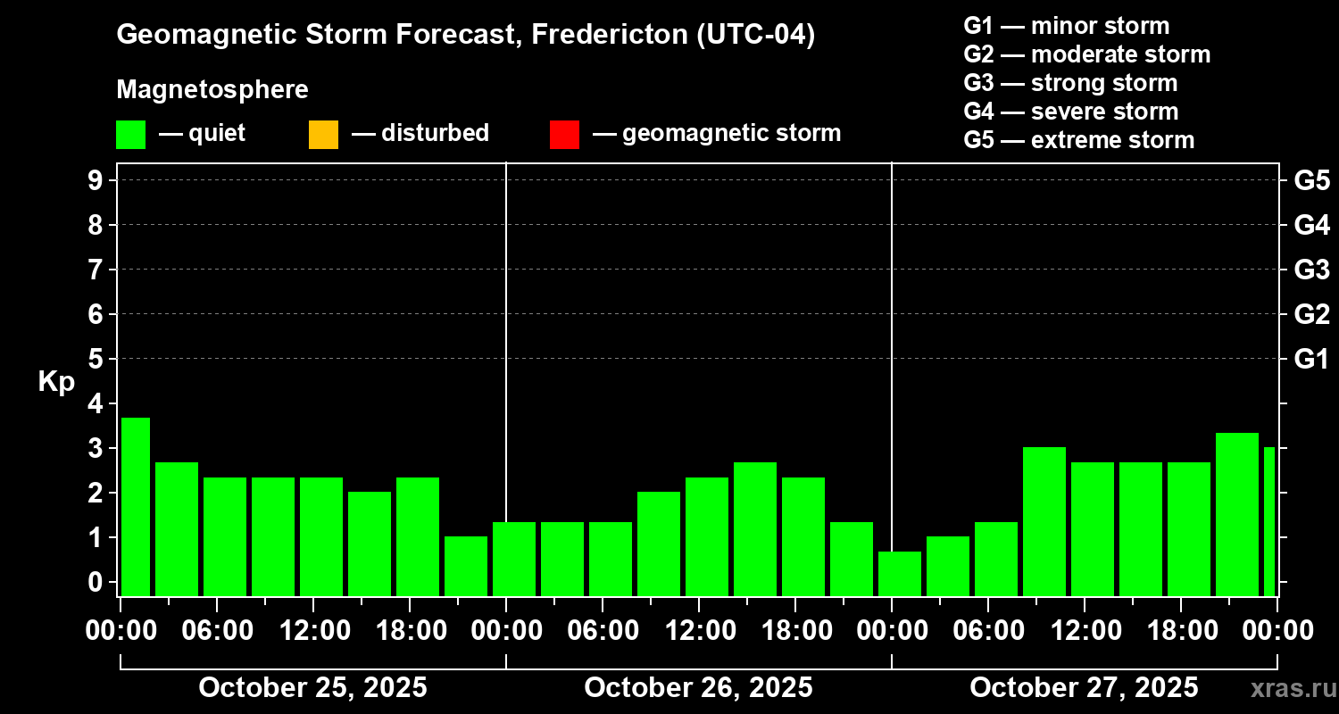 Geomagnetic storm forecast in Fredericton for Oct 25, 2025