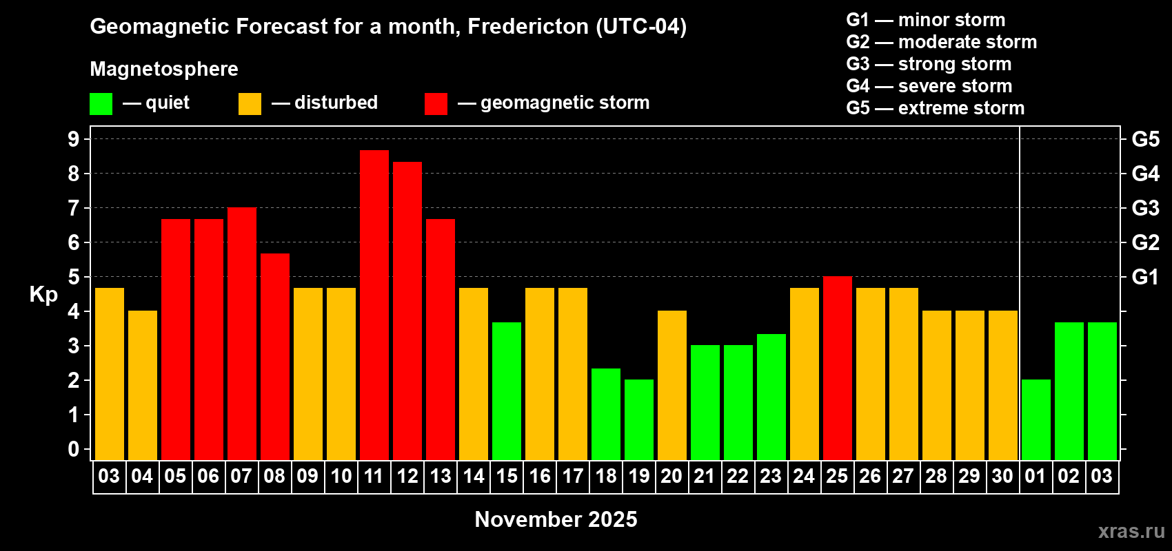 Geomagnetic storm forecast in Fredericton for Nov 03, 2025