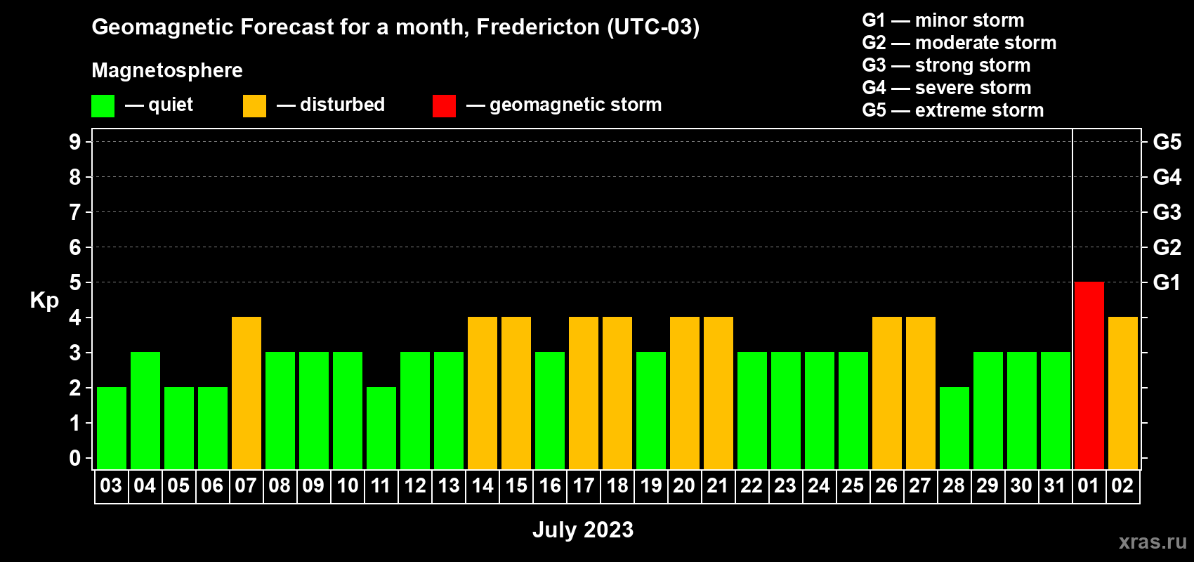 Geomagnetic storm forecast in Fredericton for Jul 03, 2023