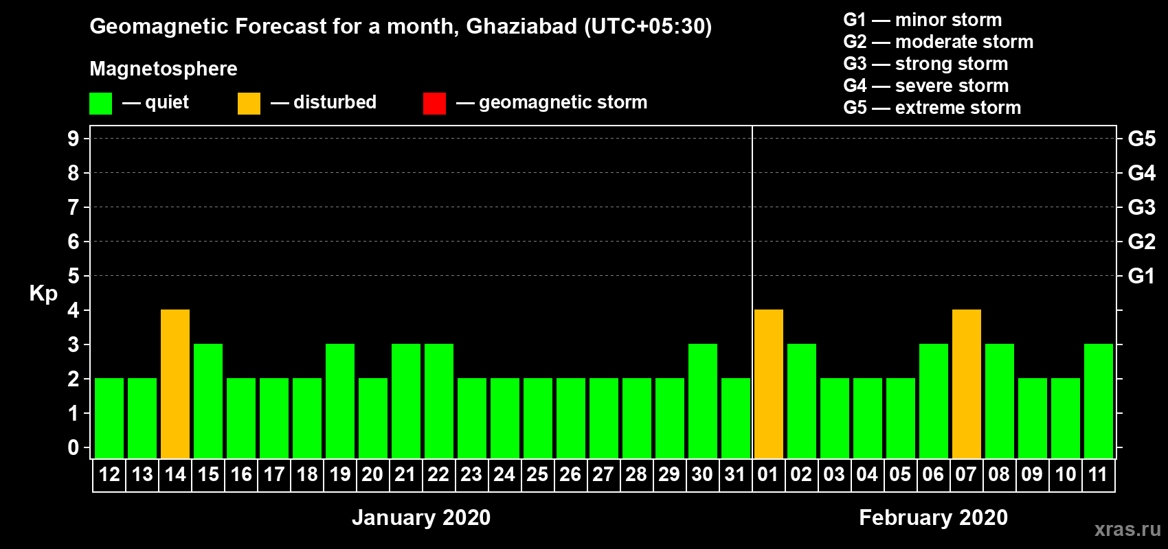 Geomagnetic storm forecast in Ghaziabad for Jan 12, 2020