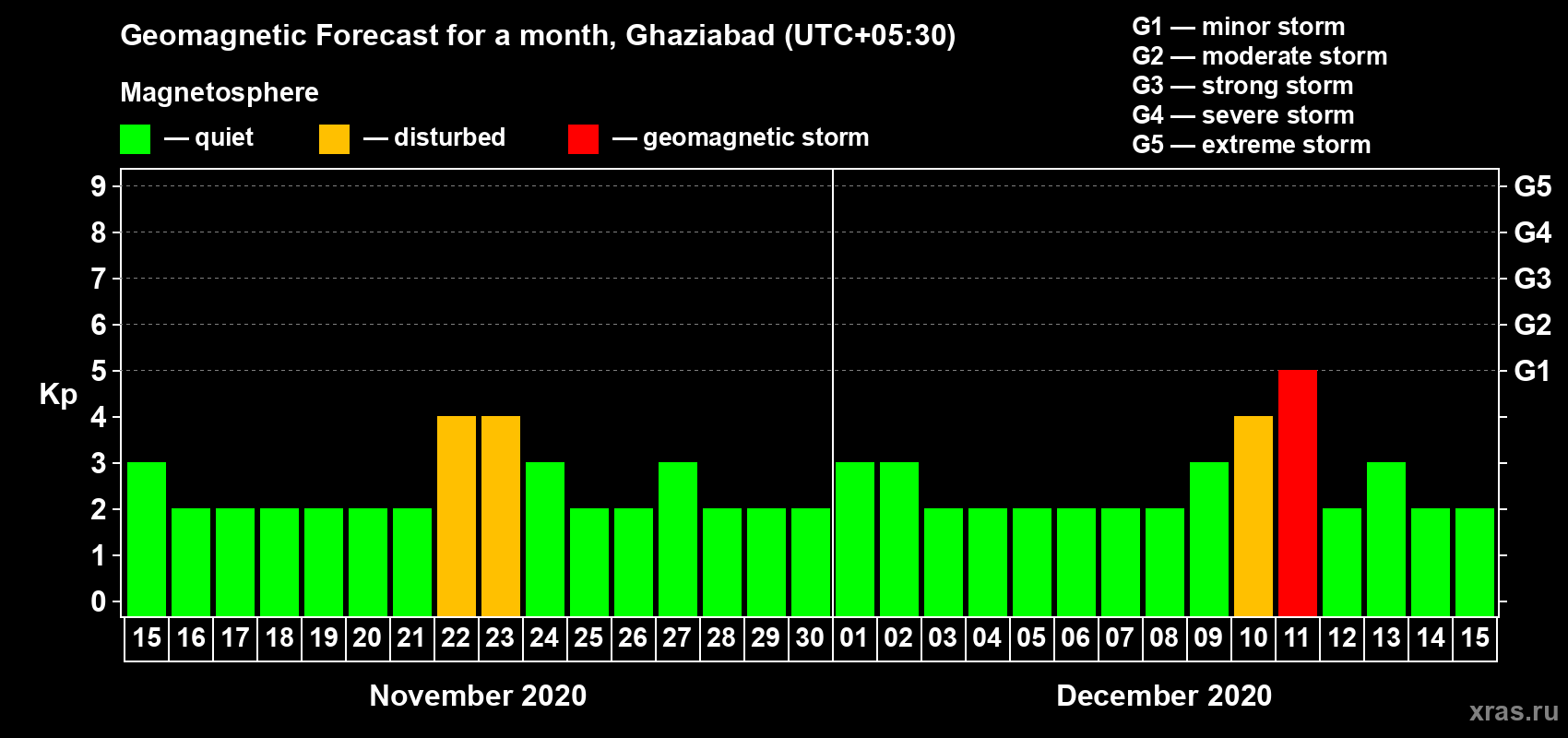 Geomagnetic storm forecast in Ghaziabad for Nov 15, 2020