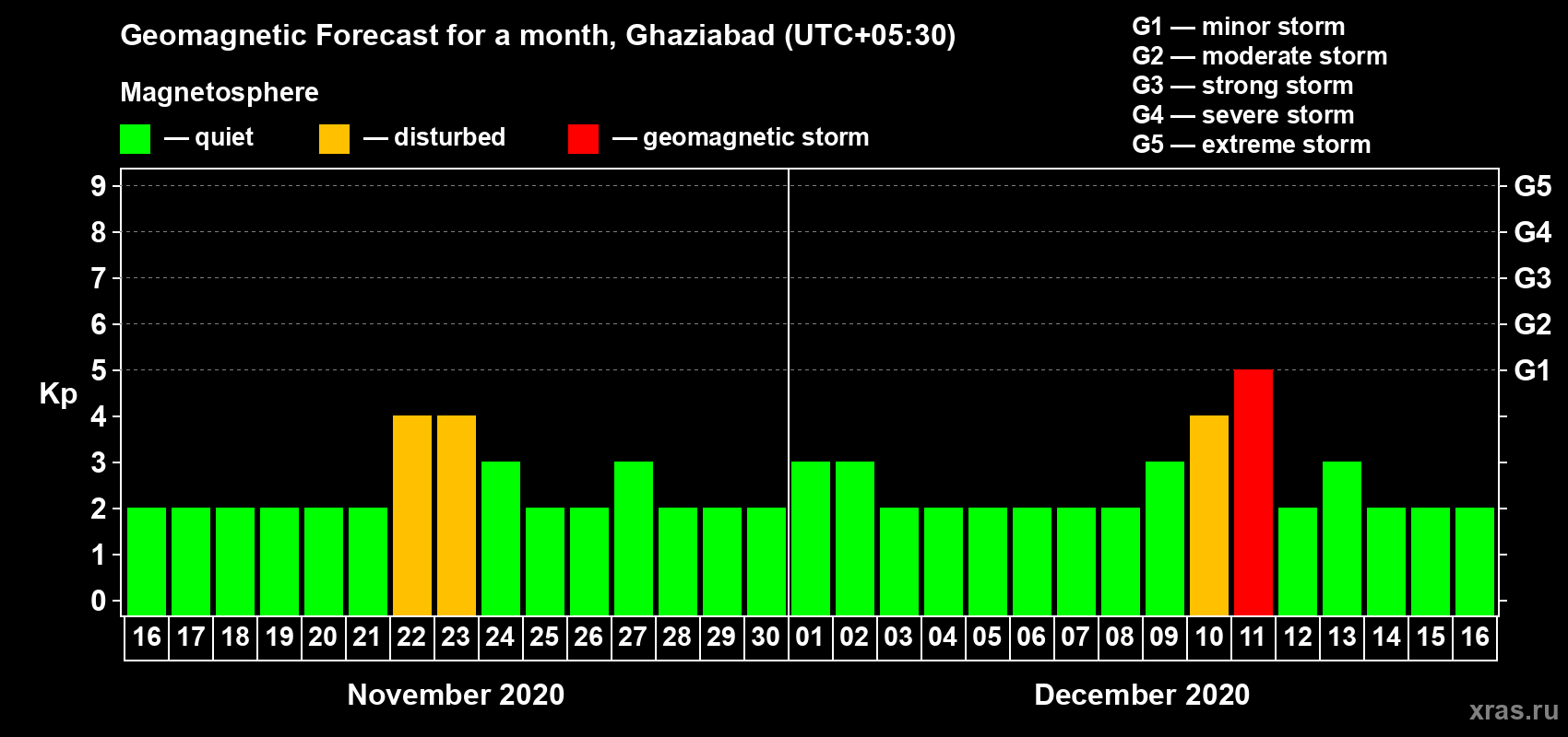 Geomagnetic storm forecast in Ghaziabad for Nov 16, 2020
