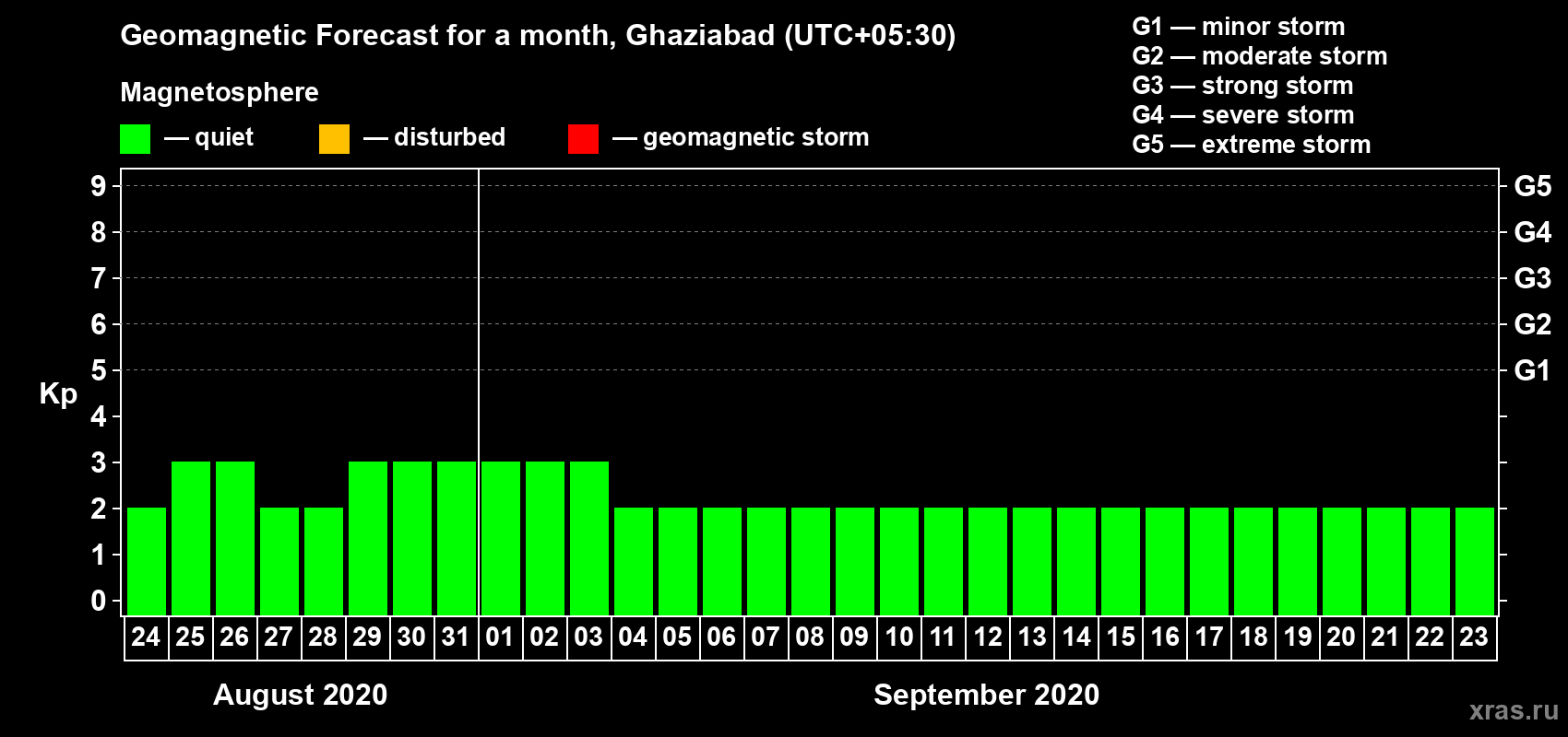 Geomagnetic storm forecast in Ghaziabad for Aug 24, 2020