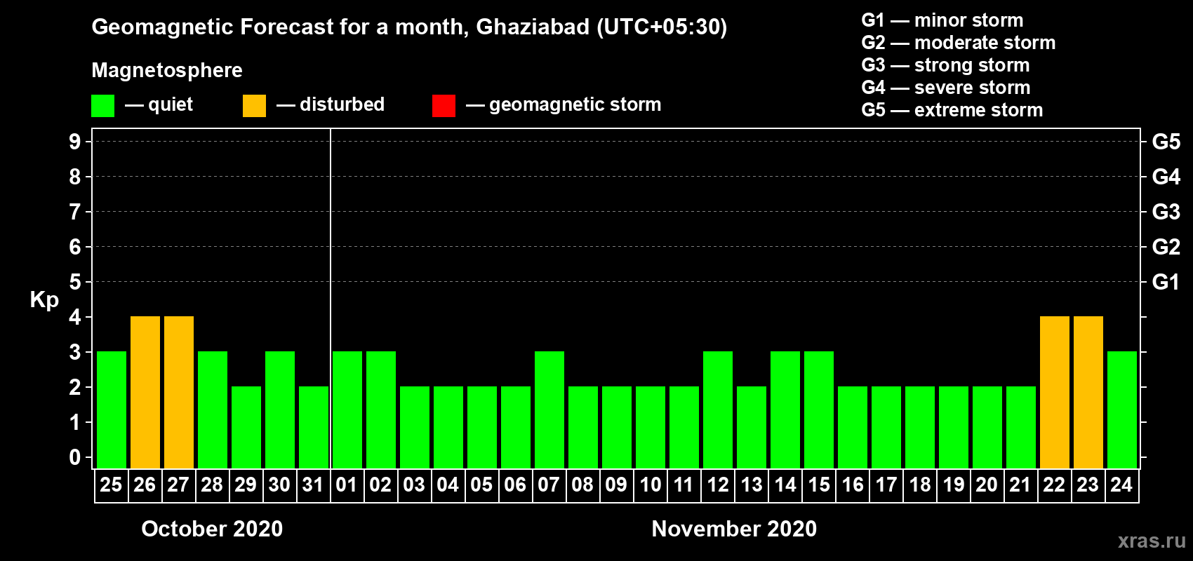 Geomagnetic storm forecast in Ghaziabad for Oct 25, 2020