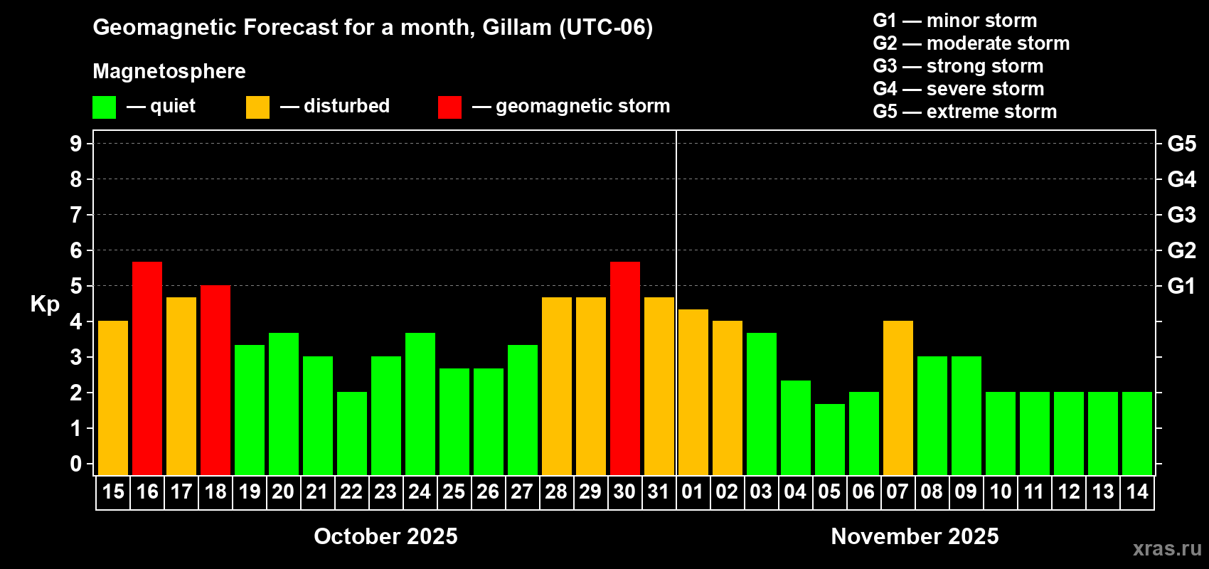 Geomagnetic storm forecast in Gillam for Oct 15, 2025