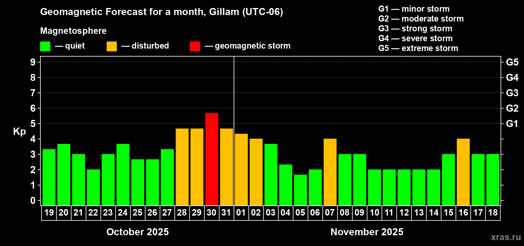 Geomagnetic storm forecast in Gillam for Oct 19, 2025