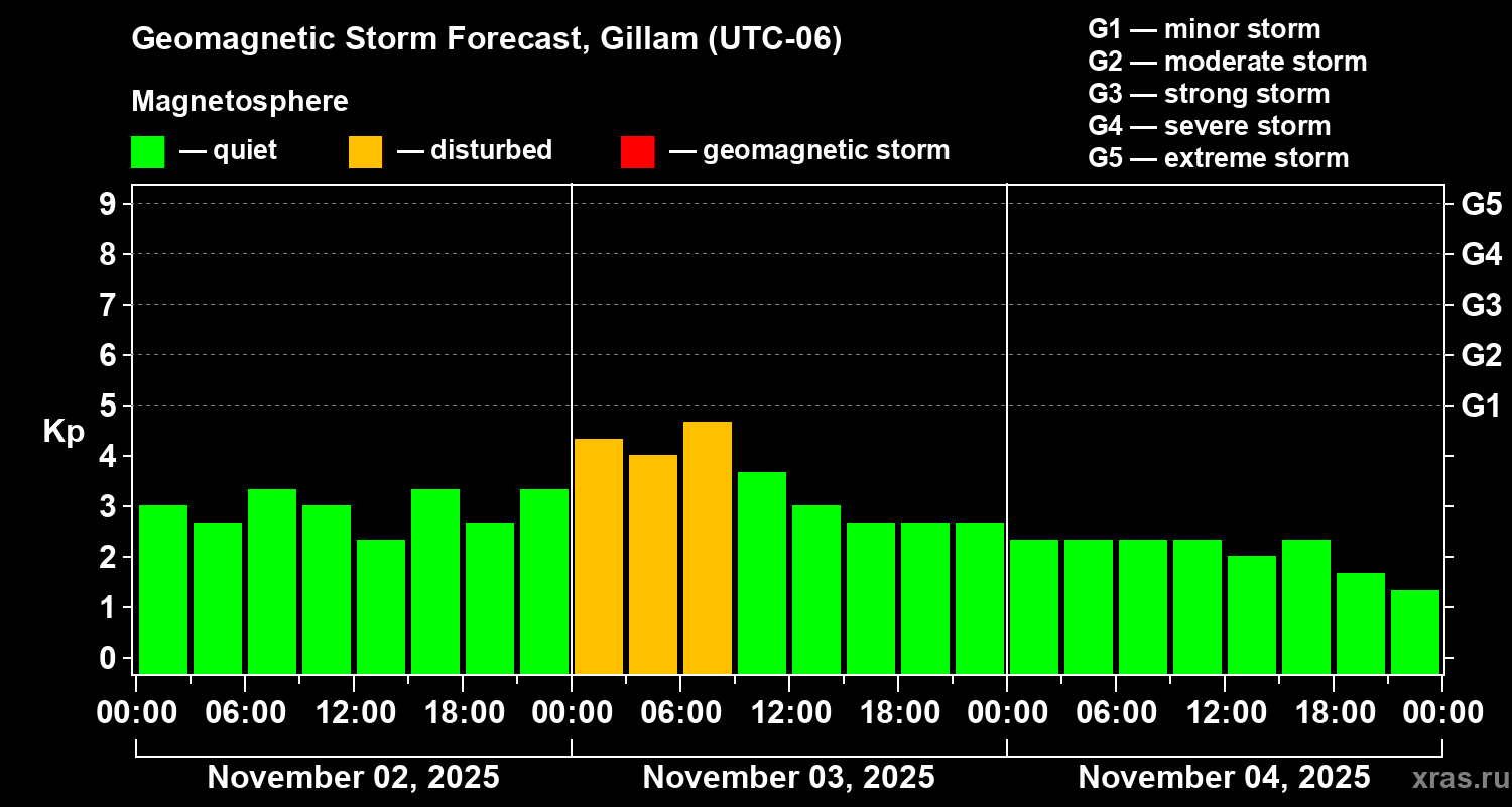 Geomagnetic storm forecast in Gillam for Nov 02, 2025