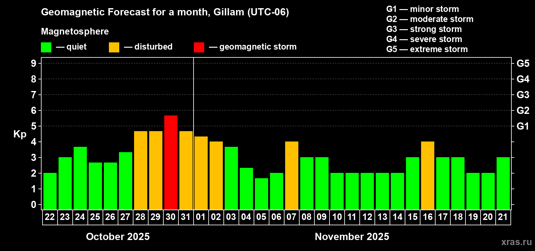 Geomagnetic storm forecast in Gillam for Oct 22, 2025