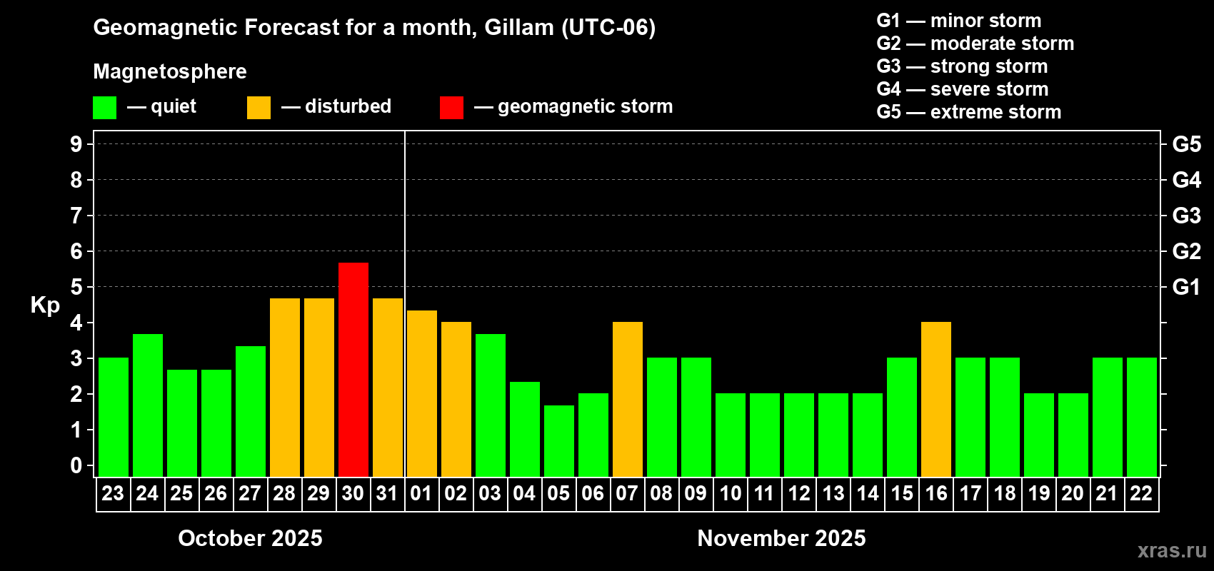 Geomagnetic storm forecast in Gillam for Oct 23, 2025
