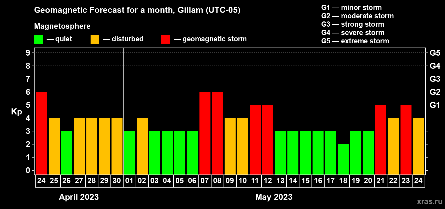 Geomagnetic storm forecast in Gillam for Apr 24, 2023